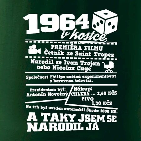 Narozeninové tričko pro ročník 1964. Sháníš originální dárek? Triko pro ročník 1964 v kostce je ten nejlepší dárek, kterým jistě potěšíš. Kolik co stálo? Kdo byl prezident? Kdo se narodil? Všechno tohle a ještě mnohem víc najdeš na našem oslaveneckém triku!