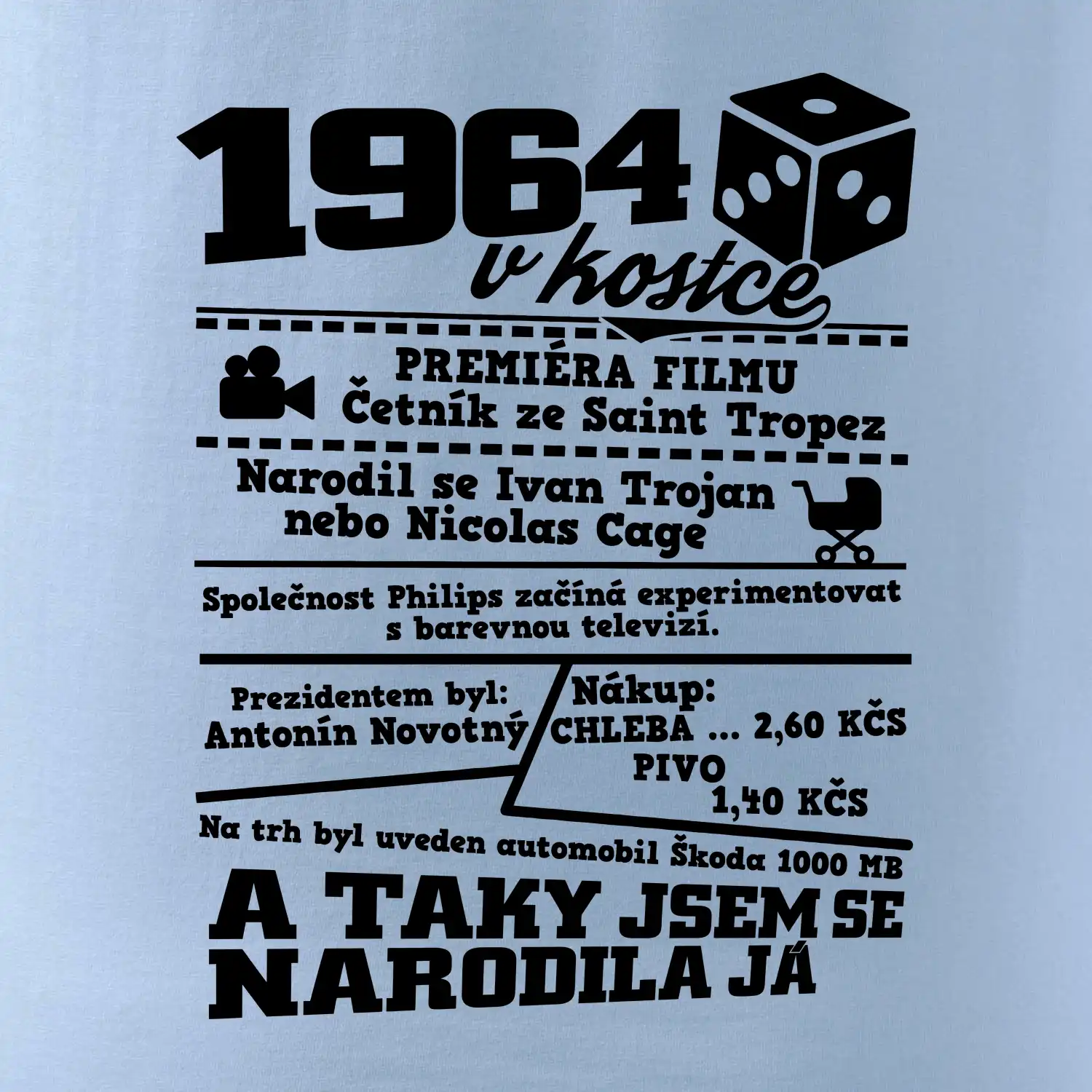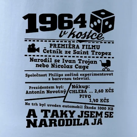 Narozeninové tričko pro ročník 1964. Sháníš originální dárek? Triko pro ročník 1964 v kostce je ten nejlepší dárek, kterým jistě potěšíš. Kolik co stálo? Kdo byl prezident? Kdo se narodil? Všechno tohle a ještě mnohem víc najdeš na našem oslaveneckém triku!