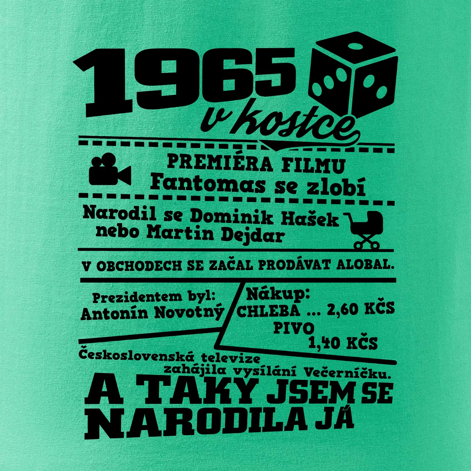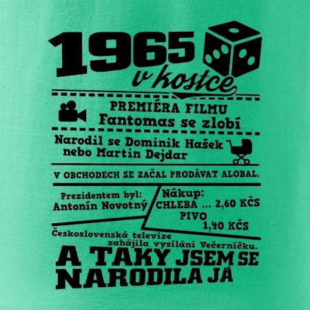 Narozeninové tričko pro ročník 1965. Sháníš originální dárek? Triko pro ročník 1965 v kostce je ten nejlepší dárek, kterým jistě potěšíš. Kolik co stálo? Kdo byl prezident? Kdo se narodil? Všechno tohle a ještě mnohem víc najdeš na našem oslaveneckém triku!