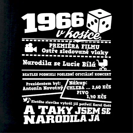 Narozeninové tričko pro ročník 1966. Sháníš originální dárek? Triko pro ročník 1966 v kostce je ten nejlepší dárek, kterým jistě potěšíš. Kolik co stálo? Kdo byl prezident? Kdo se narodil? Všechno tohle a ještě mnohem víc najdeš na našem oslaveneckém triku!