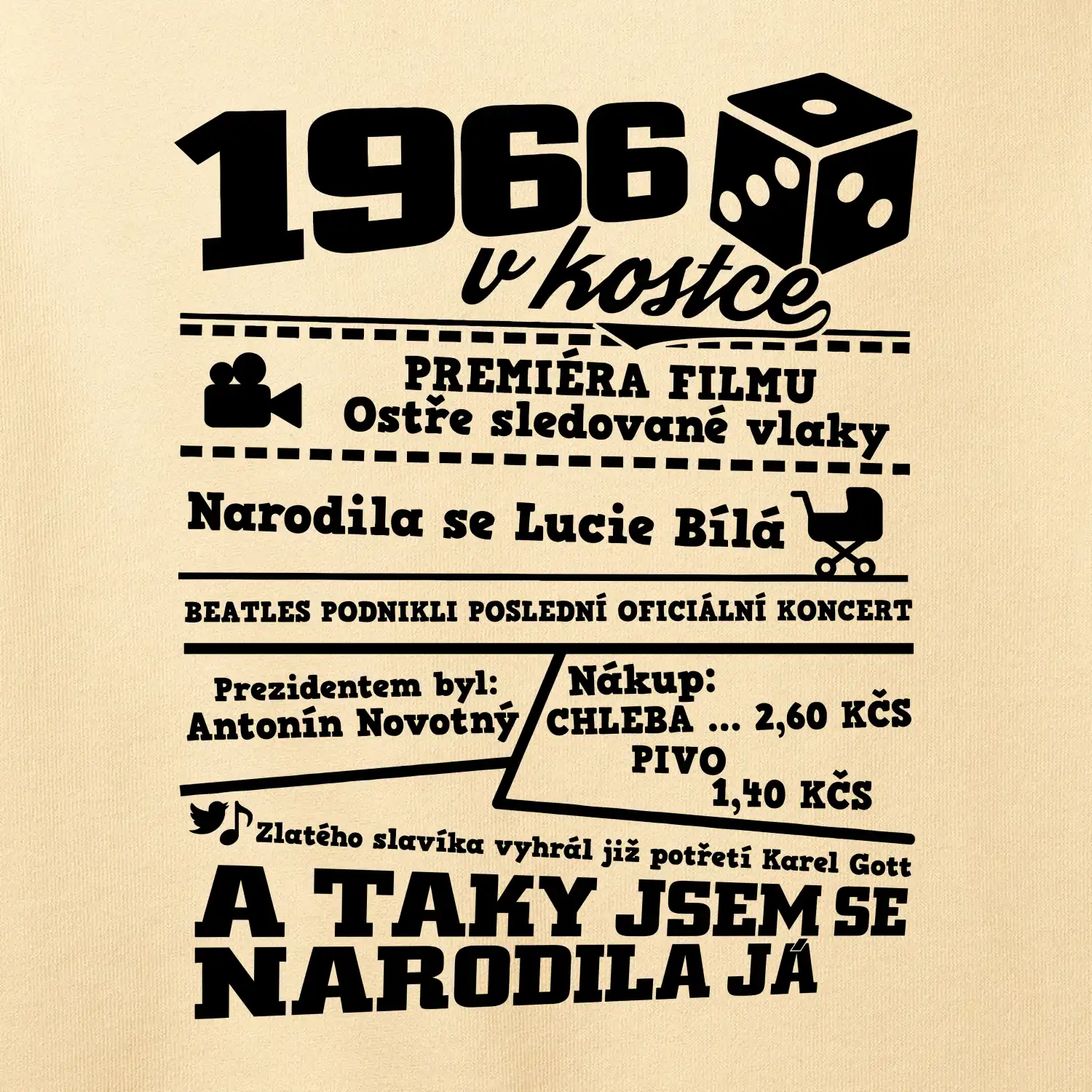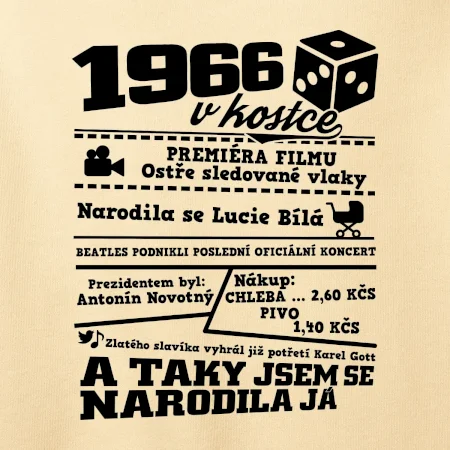Narozeninové tričko pro ročník 1966. Sháníš originální dárek? Triko pro ročník 1966 v kostce je ten nejlepší dárek, kterým jistě potěšíš. Kolik co stálo? Kdo byl prezident? Kdo se narodil? Všechno tohle a ještě mnohem víc najdeš na našem oslaveneckém triku!