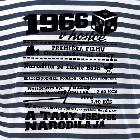 Narozeninové tričko pro ročník 1966. Sháníš originální dárek? Triko pro ročník 1966 v kostce je ten nejlepší dárek, kterým jistě potěšíš. Kolik co stálo? Kdo byl prezident? Kdo se narodil? Všechno tohle a ještě mnohem víc najdeš na našem oslaveneckém triku!