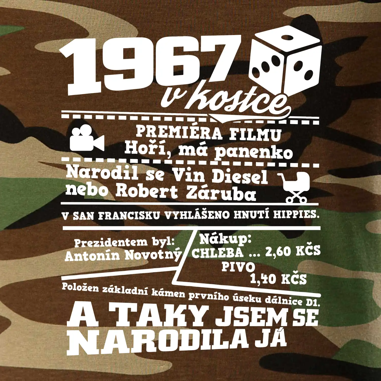 Narozeninové tričko pro ročník 1967. Sháníš originální dárek? Triko pro ročník 1967 v kostce je ten nejlepší dárek, kterým jistě potěšíš. Kolik co stálo? Kdo byl prezident? Kdo se narodil? Všechno tohle a ještě mnohem víc najdeš na našem oslaveneckém triku!