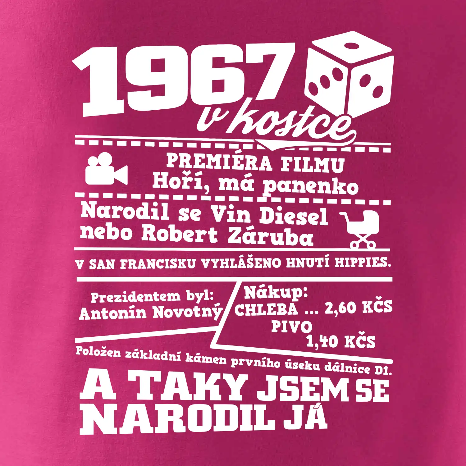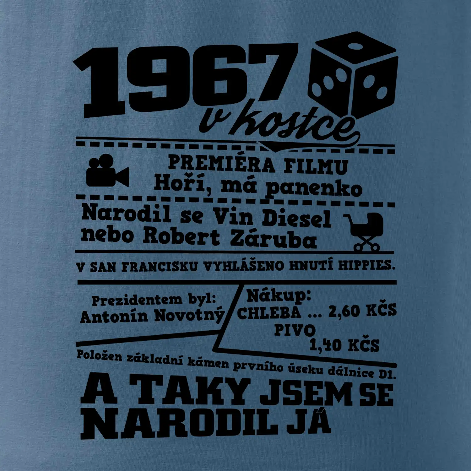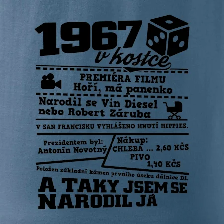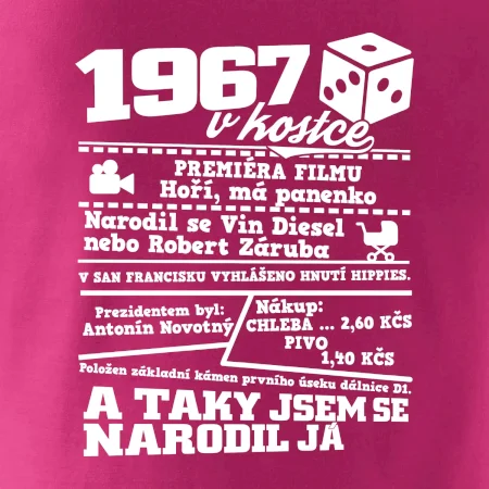 Narozeninové tričko pro ročník 1967. Sháníš originální dárek? Triko pro ročník 1967 v kostce je ten nejlepší dárek, kterým jistě potěšíš. Kolik co stálo? Kdo byl prezident? Kdo se narodil? Všechno tohle a ještě mnohem víc najdeš na našem oslaveneckém triku!