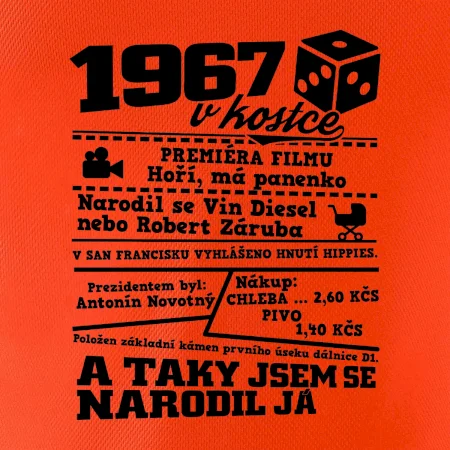 Narozeninové tričko pro ročník 1967. Sháníš originální dárek? Triko pro ročník 1967 v kostce je ten nejlepší dárek, kterým jistě potěšíš. Kolik co stálo? Kdo byl prezident? Kdo se narodil? Všechno tohle a ještě mnohem víc najdeš na našem oslaveneckém triku!