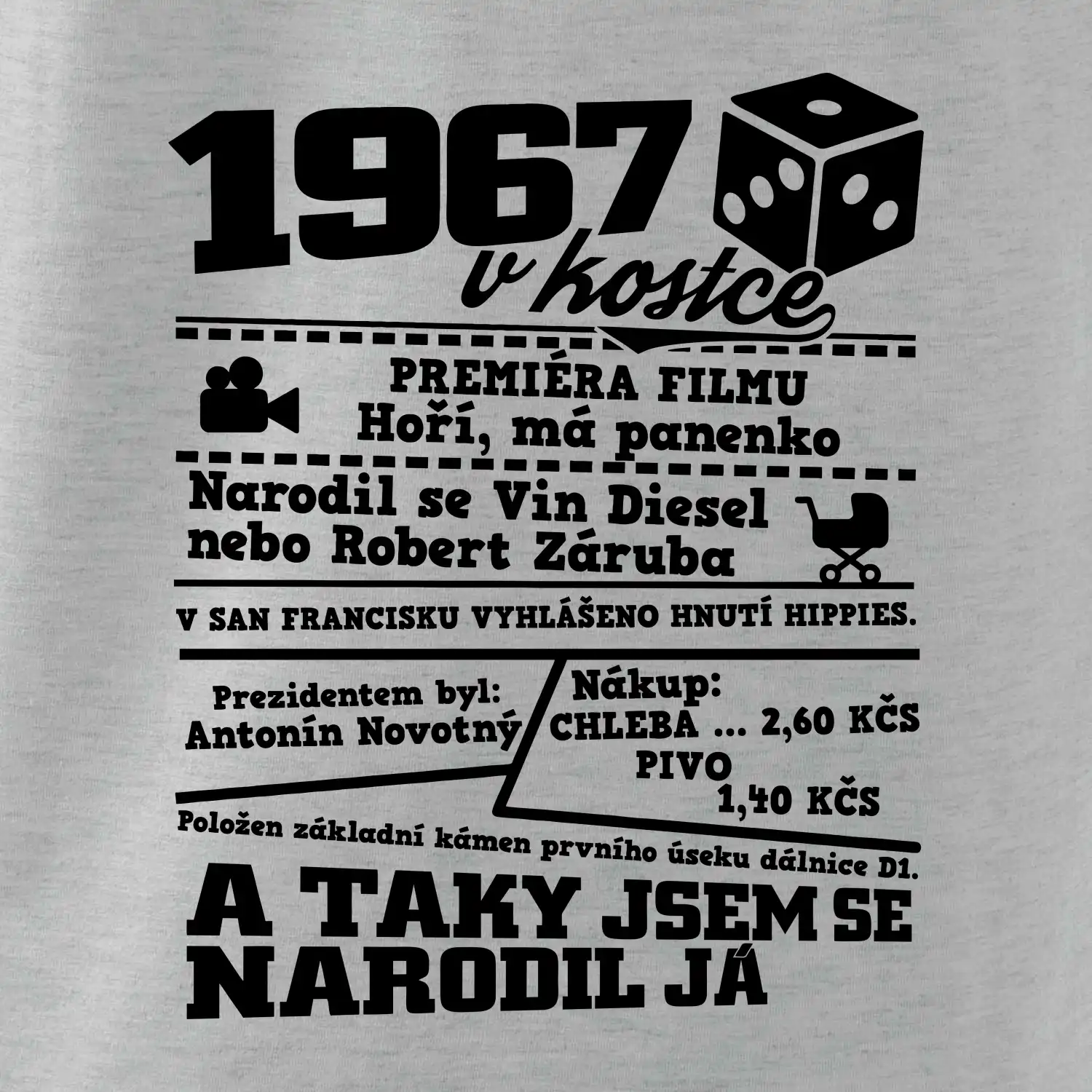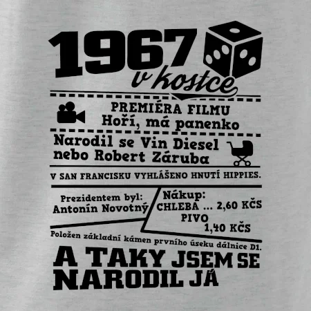 Narozeninové tričko pro ročník 1967. Sháníš originální dárek? Triko pro ročník 1967 v kostce je ten nejlepší dárek, kterým jistě potěšíš. Kolik co stálo? Kdo byl prezident? Kdo se narodil? Všechno tohle a ještě mnohem víc najdeš na našem oslaveneckém triku!