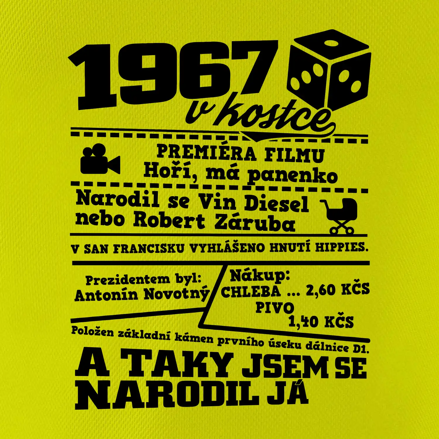 Narozeninové tričko pro ročník 1967. Sháníš originální dárek? Triko pro ročník 1967 v kostce je ten nejlepší dárek, kterým jistě potěšíš. Kolik co stálo? Kdo byl prezident? Kdo se narodil? Všechno tohle a ještě mnohem víc najdeš na našem oslaveneckém triku!