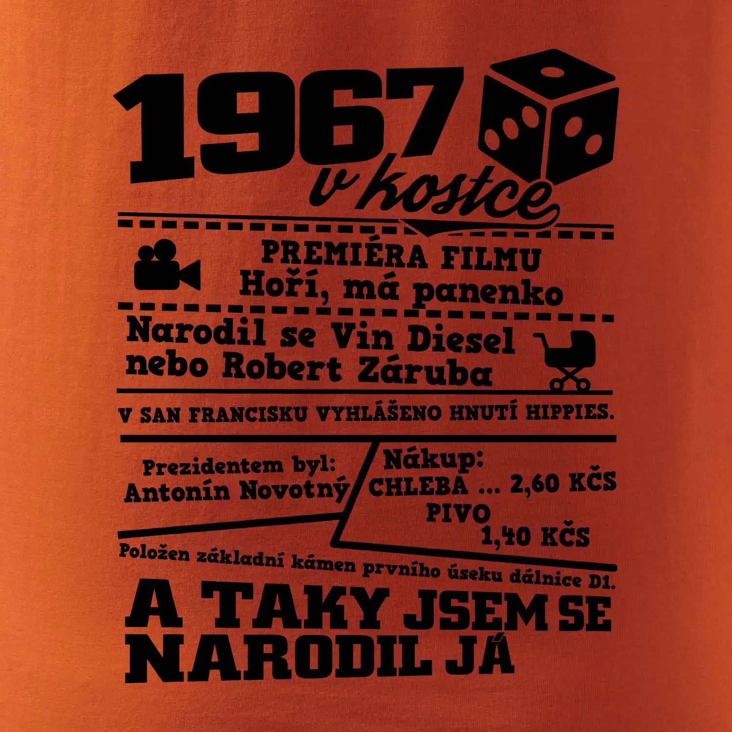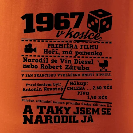 Narozeninové tričko pro ročník 1967. Sháníš originální dárek? Triko pro ročník 1967 v kostce je ten nejlepší dárek, kterým jistě potěšíš. Kolik co stálo? Kdo byl prezident? Kdo se narodil? Všechno tohle a ještě mnohem víc najdeš na našem oslaveneckém triku!