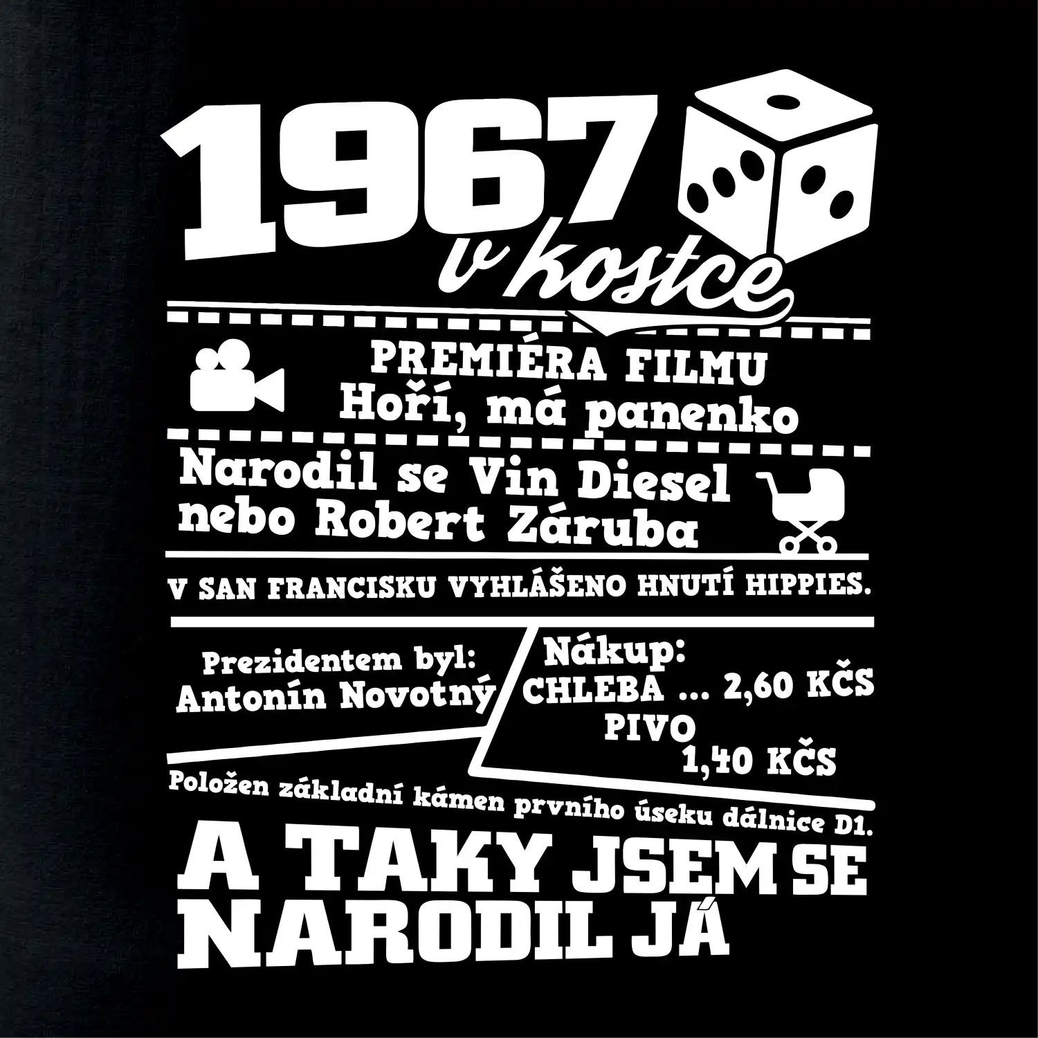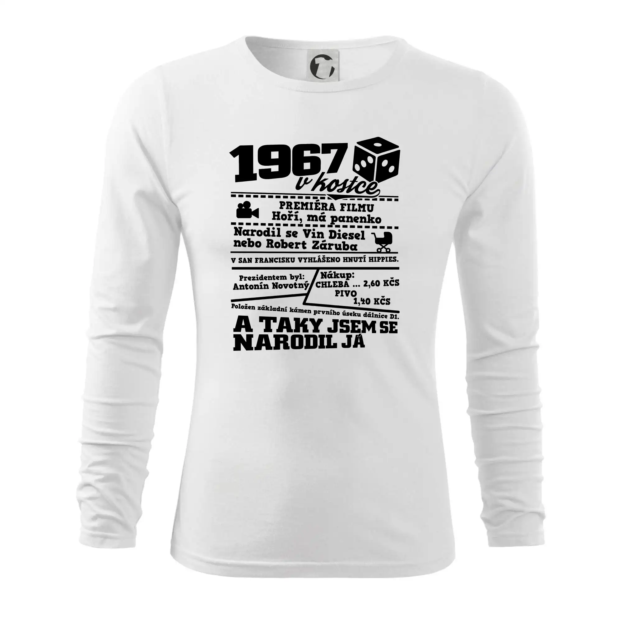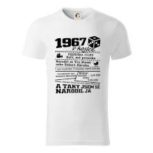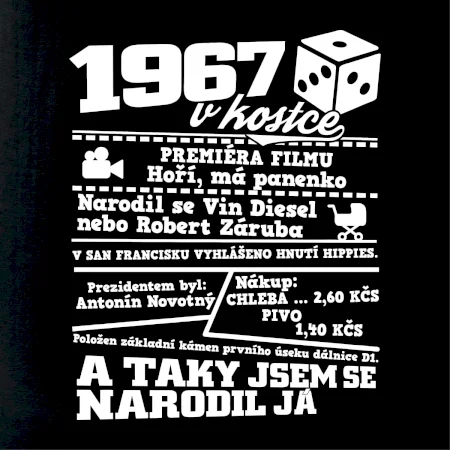 Narozeninové tričko pro ročník 1967. Sháníš originální dárek? Triko pro ročník 1967 v kostce je ten nejlepší dárek, kterým jistě potěšíš. Kolik co stálo? Kdo byl prezident? Kdo se narodil? Všechno tohle a ještě mnohem víc najdeš na našem oslaveneckém triku!