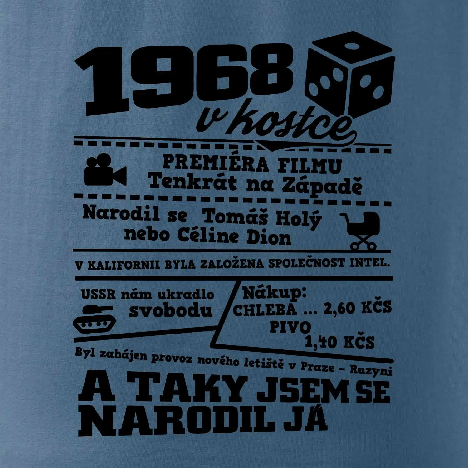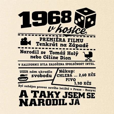 Narozeninové tričko pro ročník 1968. Sháníš originální dárek? Triko pro ročník 1968 v kostce je ten nejlepší dárek, kterým jistě potěšíš. Kolik co stálo? Kdo byl prezident? Kdo se narodil? Všechno tohle a ještě mnohem víc najdeš na našem oslaveneckém triku!