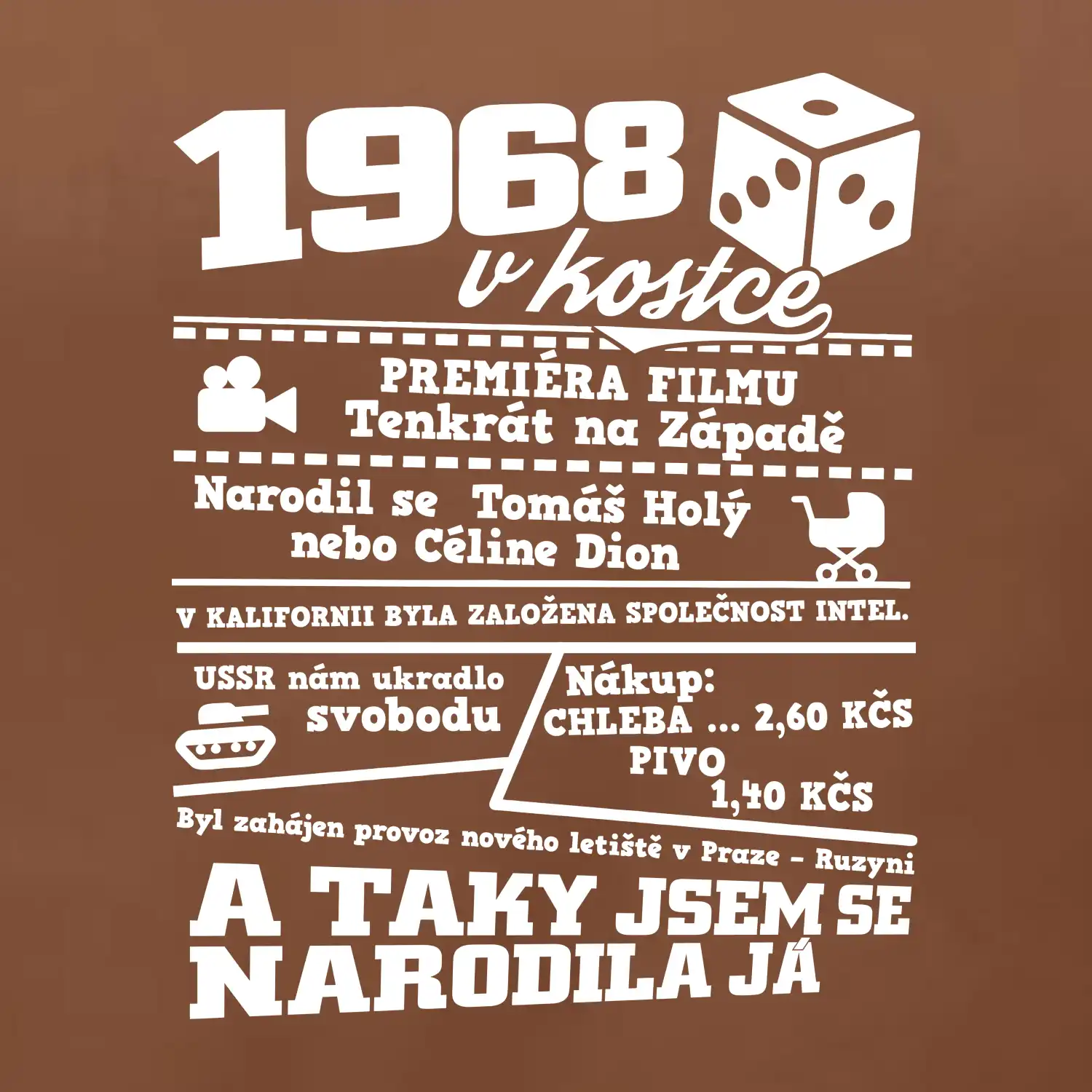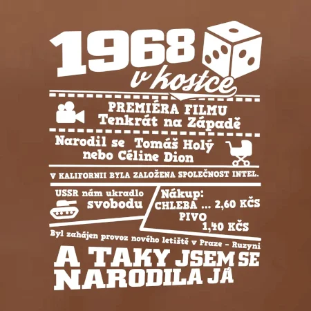 Narozeninové tričko pro ročník 1968. Sháníš originální dárek? Triko pro ročník 1968v kostce je ten nejlepší dárek, kterým jistě potěšíš. Kolik co stálo? Kdo byl prezident? Kdo se narodil? Všechno tohle a ještě mnohem víc najdeš na našem oslaveneckém triku!