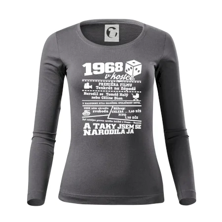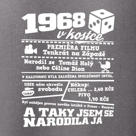 Narozeninové tričko pro ročník 1968. Sháníš originální dárek? Triko pro ročník 1968v kostce je ten nejlepší dárek, kterým jistě potěšíš. Kolik co stálo? Kdo byl prezident? Kdo se narodil? Všechno tohle a ještě mnohem víc najdeš na našem oslaveneckém triku!