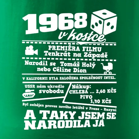 Narozeninové tričko pro ročník 1968. Sháníš originální dárek? Triko pro ročník 1968v kostce je ten nejlepší dárek, kterým jistě potěšíš. Kolik co stálo? Kdo byl prezident? Kdo se narodil? Všechno tohle a ještě mnohem víc najdeš na našem oslaveneckém triku!
