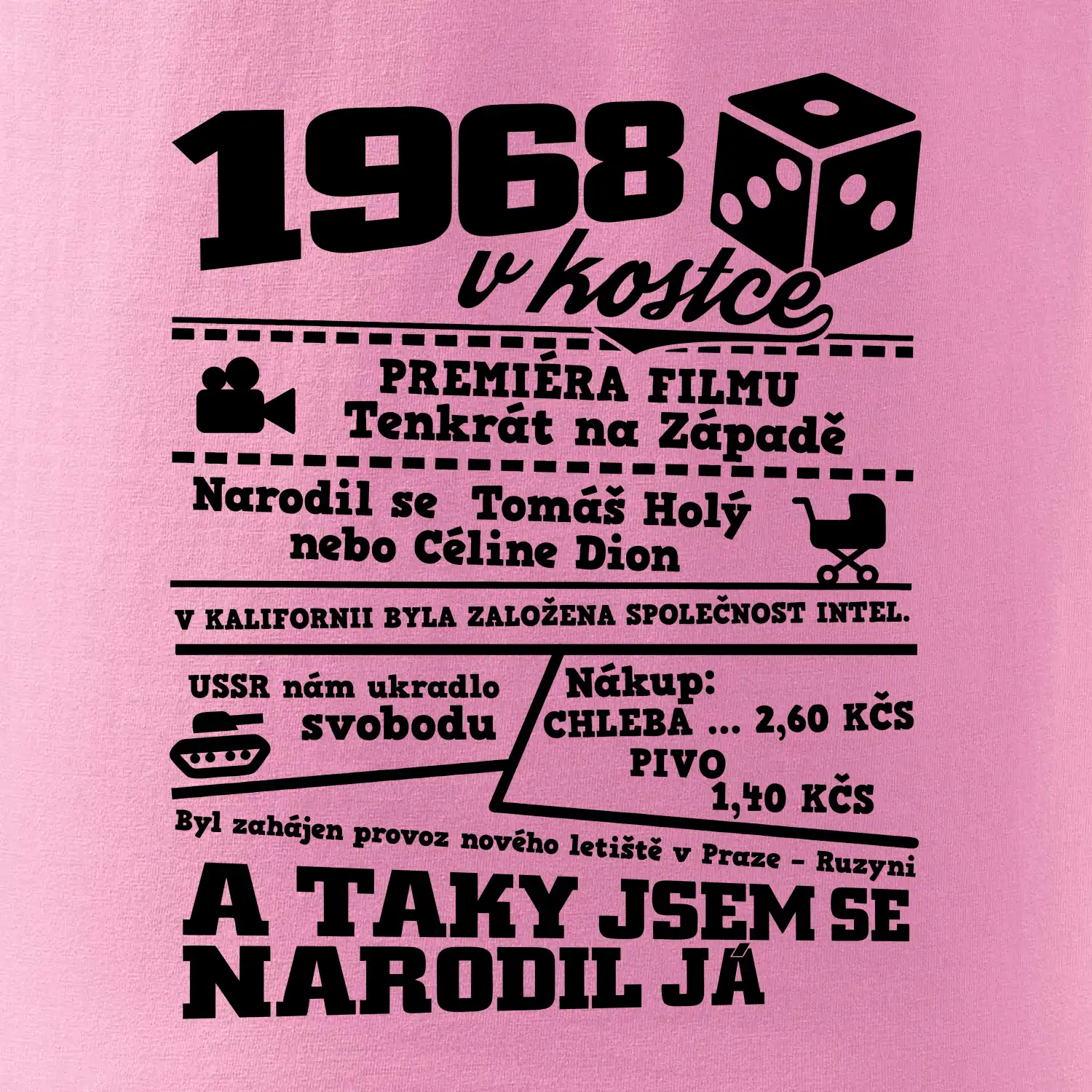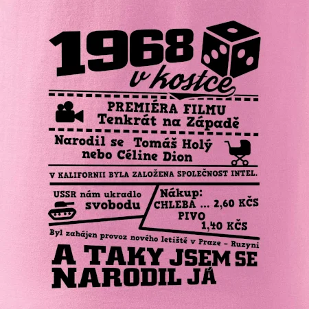 Narozeninové tričko pro ročník 1968. Sháníš originální dárek? Triko pro ročník 1968 v kostce je ten nejlepší dárek, kterým jistě potěšíš. Kolik co stálo? Kdo byl prezident? Kdo se narodil? Všechno tohle a ještě mnohem víc najdeš na našem oslaveneckém triku!