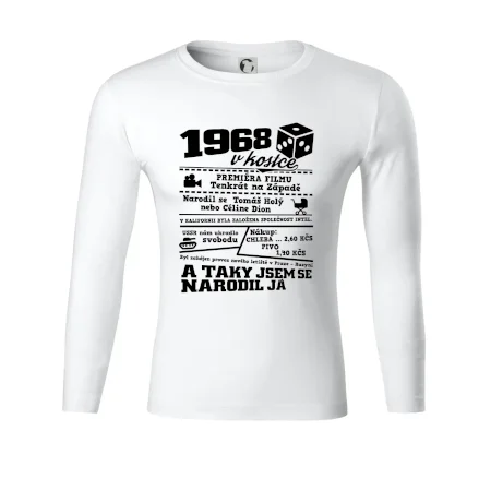 Narozeninové tričko pro ročník 1968. Sháníš originální dárek? Triko pro ročník 1968 v kostce je ten nejlepší dárek, kterým jistě potěšíš. Kolik co stálo? Kdo byl prezident? Kdo se narodil? Všechno tohle a ještě mnohem víc najdeš na našem oslaveneckém triku!