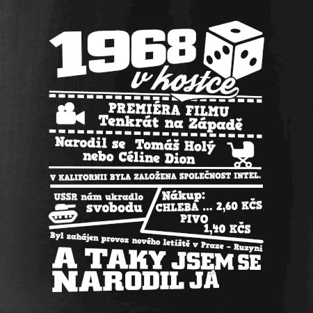 Narozeninové tričko pro ročník 1968. Sháníš originální dárek? Triko pro ročník 1968 v kostce je ten nejlepší dárek, kterým jistě potěšíš. Kolik co stálo? Kdo byl prezident? Kdo se narodil? Všechno tohle a ještě mnohem víc najdeš na našem oslaveneckém triku!
