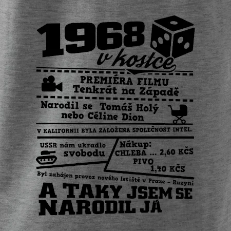 Narozeninové tričko pro ročník 1968. Sháníš originální dárek? Triko pro ročník 1968 v kostce je ten nejlepší dárek, kterým jistě potěšíš. Kolik co stálo? Kdo byl prezident? Kdo se narodil? Všechno tohle a ještě mnohem víc najdeš na našem oslaveneckém triku!