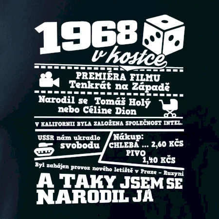 Narozeninové tričko pro ročník 1968. Sháníš originální dárek? Triko pro ročník 1968 v kostce je ten nejlepší dárek, kterým jistě potěšíš. Kolik co stálo? Kdo byl prezident? Kdo se narodil? Všechno tohle a ještě mnohem víc najdeš na našem oslaveneckém triku!
