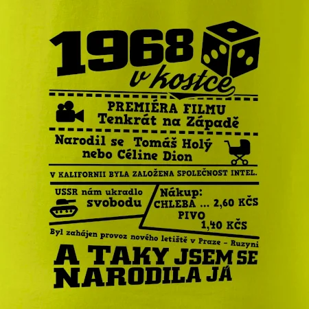 Narozeninové tričko pro ročník 1968. Sháníš originální dárek? Triko pro ročník 1968v kostce je ten nejlepší dárek, kterým jistě potěšíš. Kolik co stálo? Kdo byl prezident? Kdo se narodil? Všechno tohle a ještě mnohem víc najdeš na našem oslaveneckém triku!