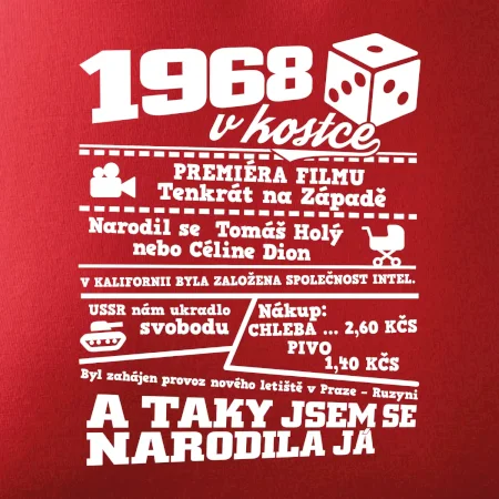 Narozeninové tričko pro ročník 1968. Sháníš originální dárek? Triko pro ročník 1968v kostce je ten nejlepší dárek, kterým jistě potěšíš. Kolik co stálo? Kdo byl prezident? Kdo se narodil? Všechno tohle a ještě mnohem víc najdeš na našem oslaveneckém triku!