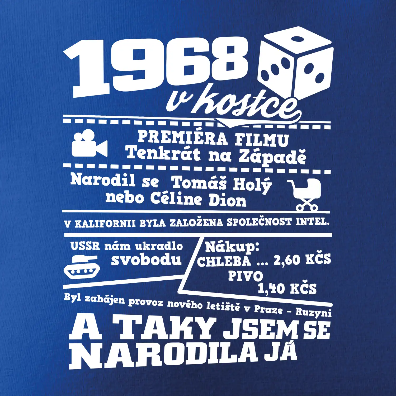 Narozeninové tričko pro ročník 1968. Sháníš originální dárek? Triko pro ročník 1968v kostce je ten nejlepší dárek, kterým jistě potěšíš. Kolik co stálo? Kdo byl prezident? Kdo se narodil? Všechno tohle a ještě mnohem víc najdeš na našem oslaveneckém triku!