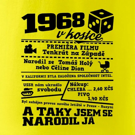 Narozeninové tričko pro ročník 1968. Sháníš originální dárek? Triko pro ročník 1968 v kostce je ten nejlepší dárek, kterým jistě potěšíš. Kolik co stálo? Kdo byl prezident? Kdo se narodil? Všechno tohle a ještě mnohem víc najdeš na našem oslaveneckém triku!