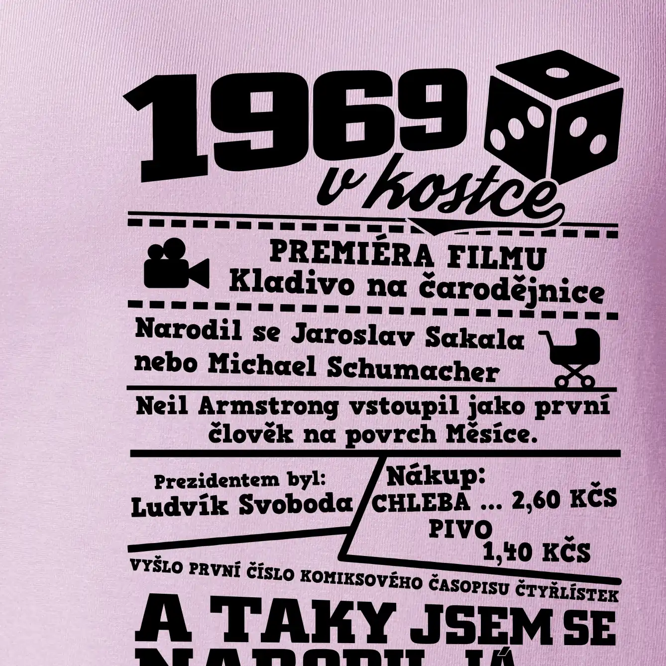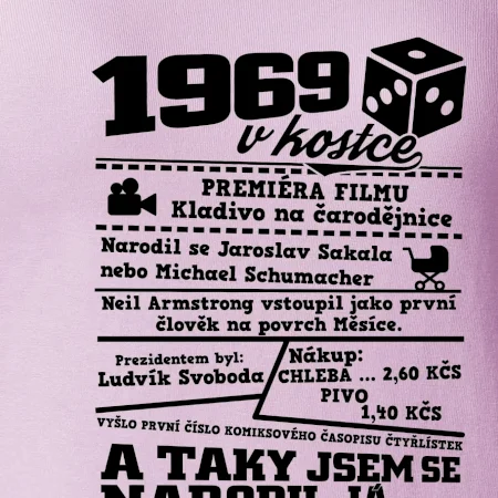Narozeninové tričko pro ročník 1969. Sháníš originální dárek? Triko pro ročník 1969 v kostce je ten nejlepší dárek, kterým jistě potěšíš. Kolik co stálo? Kdo byl prezident? Kdo se narodil? Všechno tohle a ještě mnohem víc najdeš na našem oslaveneckém triku!