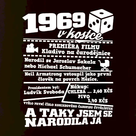 Narozeninové tričko pro ročník 1969. Sháníš originální dárek? Triko pro ročník 1969 v kostce je ten nejlepší dárek, kterým jistě potěšíš. Kolik co stálo? Kdo byl prezident? Kdo se narodil? Všechno tohle a ještě mnohem víc najdeš na našem oslaveneckém triku!