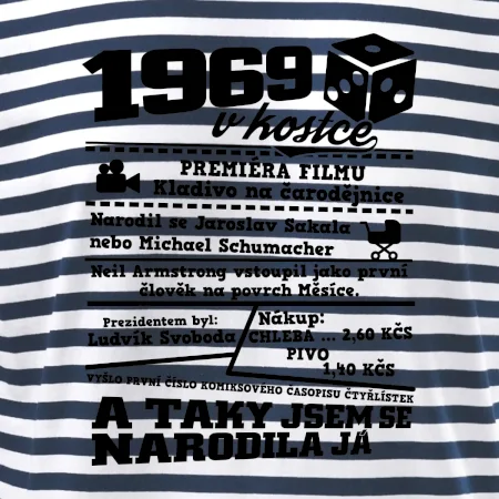 Narozeninové tričko pro ročník 1969. Sháníš originální dárek? Triko pro ročník 1969 v kostce je ten nejlepší dárek, kterým jistě potěšíš. Kolik co stálo? Kdo byl prezident? Kdo se narodil? Všechno tohle a ještě mnohem víc najdeš na našem oslaveneckém triku!
