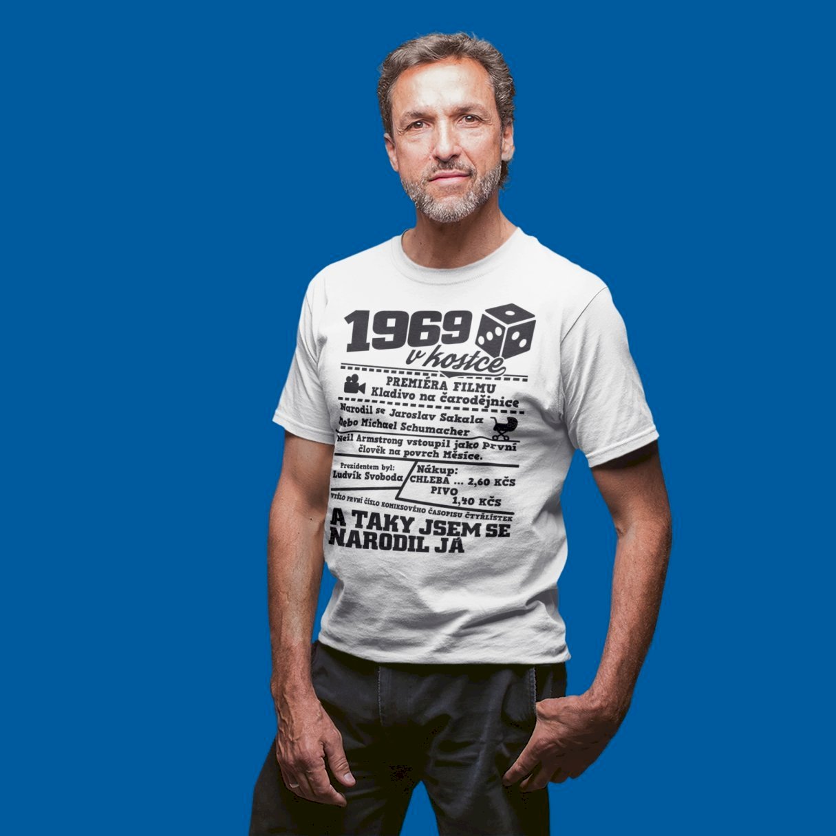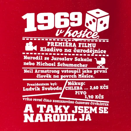 Narozeninové tričko pro ročník 1969. Sháníš originální dárek? Triko pro ročník 1969 v kostce je ten nejlepší dárek, kterým jistě potěšíš. Kolik co stálo? Kdo byl prezident? Kdo se narodil? Všechno tohle a ještě mnohem víc najdeš na našem oslaveneckém triku!