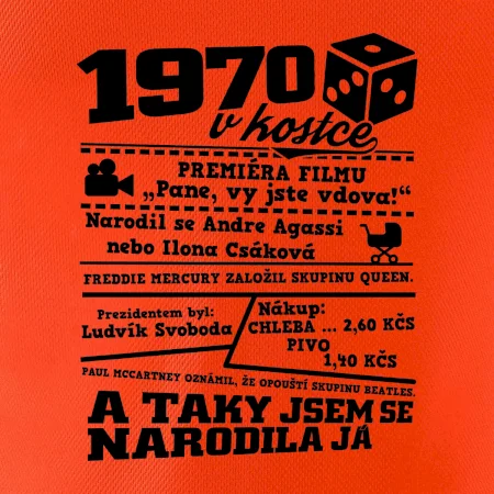 Narozeninové tričko pro ročník 1970. Sháníš originální dárek? Triko pro ročník 1970 v kostce je ten nejlepší dárek, kterým jistě potěšíš. Kolik co stálo? Kdo byl prezident? Kdo se narodil? Všechno tohle a ještě mnohem víc najdeš na našem oslaveneckém triku!