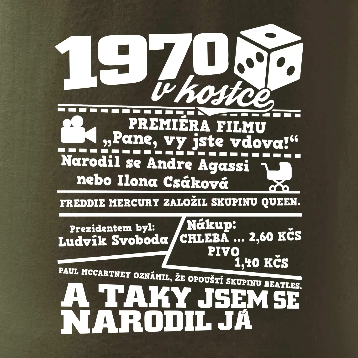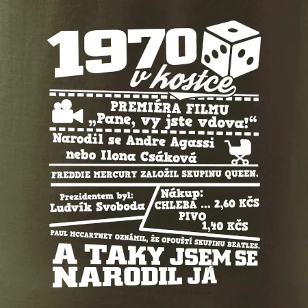 Narozeninové tričko pro ročník 1970. Sháníš originální dárek? Triko pro ročník 1970 v kostce je ten nejlepší dárek, kterým jistě potěšíš. Kolik co stálo? Kdo byl prezident? Kdo se narodil? Všechno tohle a ještě mnohem víc najdeš na našem oslaveneckém triku!
