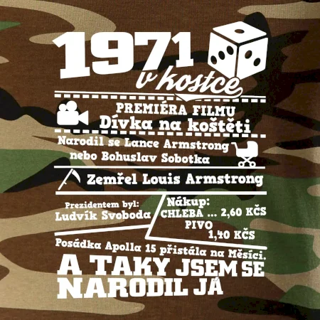 Narozeninové tričko pro ročník 1971. Sháníš originální dárek? Triko pro ročník 1971 v kostce je ten nejlepší dárek, kterým jistě potěšíš. Kolik co stálo? Kdo byl prezident? Kdo se narodil? Všechno tohle a ještě mnohem víc najdeš na našem oslaveneckém triku!