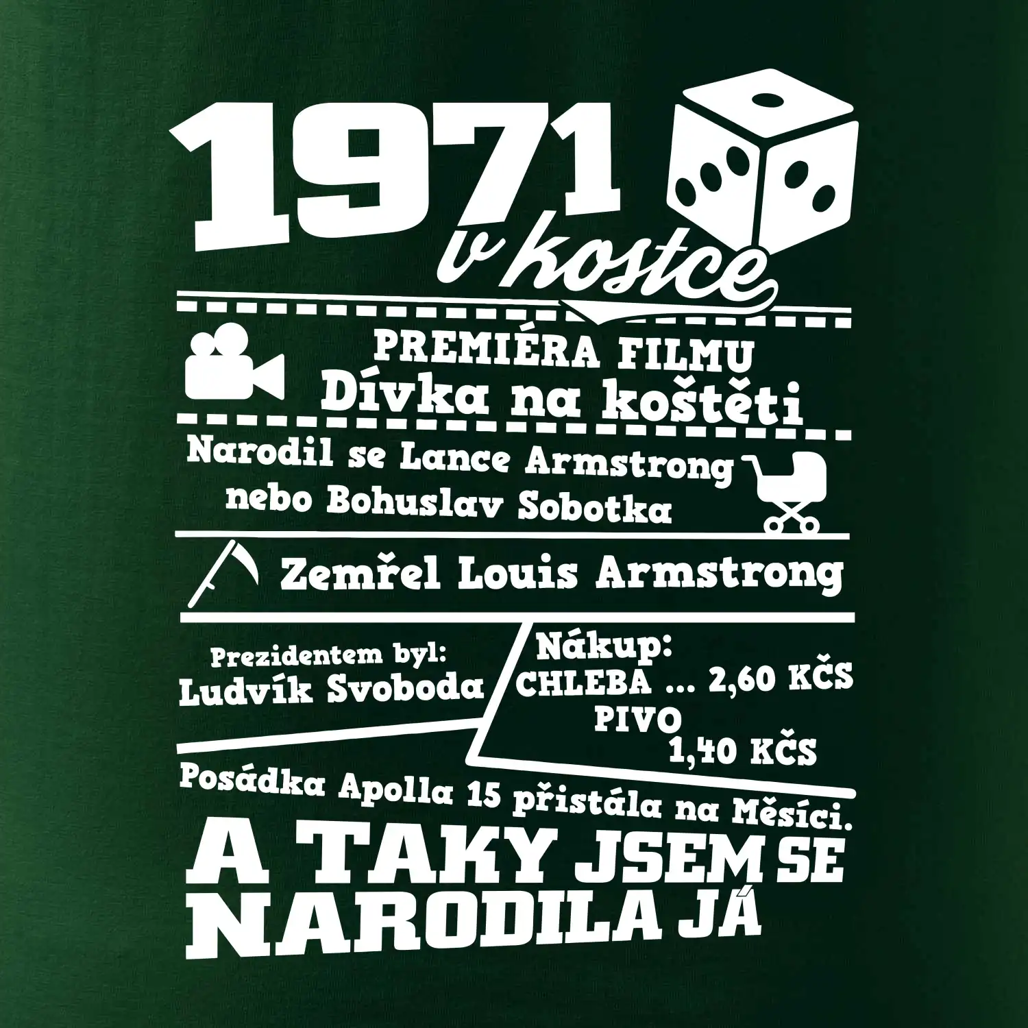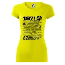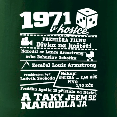 Narozeninové tričko pro ročník 1971. Sháníš originální dárek? Triko pro ročník 1971 v kostce je ten nejlepší dárek, kterým jistě potěšíš. Kolik co stálo? Kdo byl prezident? Kdo se narodil? Všechno tohle a ještě mnohem víc najdeš na našem oslaveneckém triku!