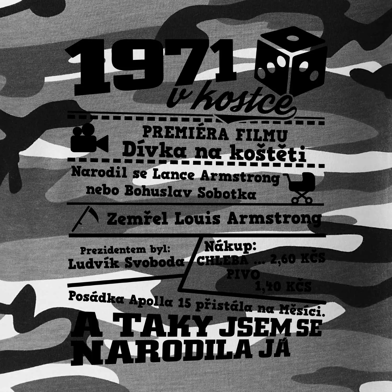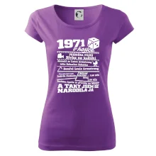 Narozeninové tričko pro ročník 1971. Sháníš originální dárek? Triko pro ročník 1971 v kostce je ten nejlepší dárek, kterým jistě potěšíš. Kolik co stálo? Kdo byl prezident? Kdo se narodil? Všechno tohle a ještě mnohem víc najdeš na našem oslaveneckém triku!