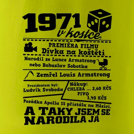 Narozeninové tričko pro ročník 1971. Sháníš originální dárek? Triko pro ročník 1971 v kostce je ten nejlepší dárek, kterým jistě potěšíš. Kolik co stálo? Kdo byl prezident? Kdo se narodil? Všechno tohle a ještě mnohem víc najdeš na našem oslaveneckém triku!