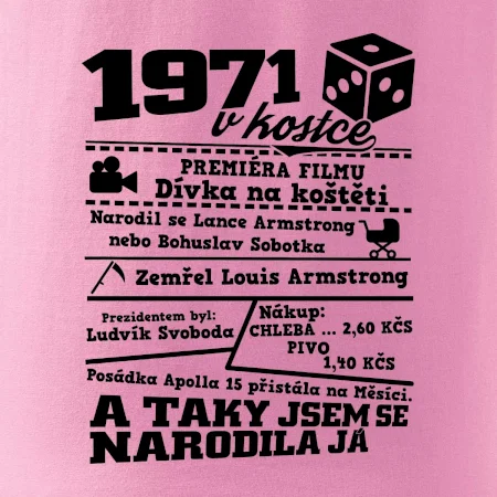 Narozeninové tričko pro ročník 1971. Sháníš originální dárek? Triko pro ročník 1971 v kostce je ten nejlepší dárek, kterým jistě potěšíš. Kolik co stálo? Kdo byl prezident? Kdo se narodil? Všechno tohle a ještě mnohem víc najdeš na našem oslaveneckém triku!