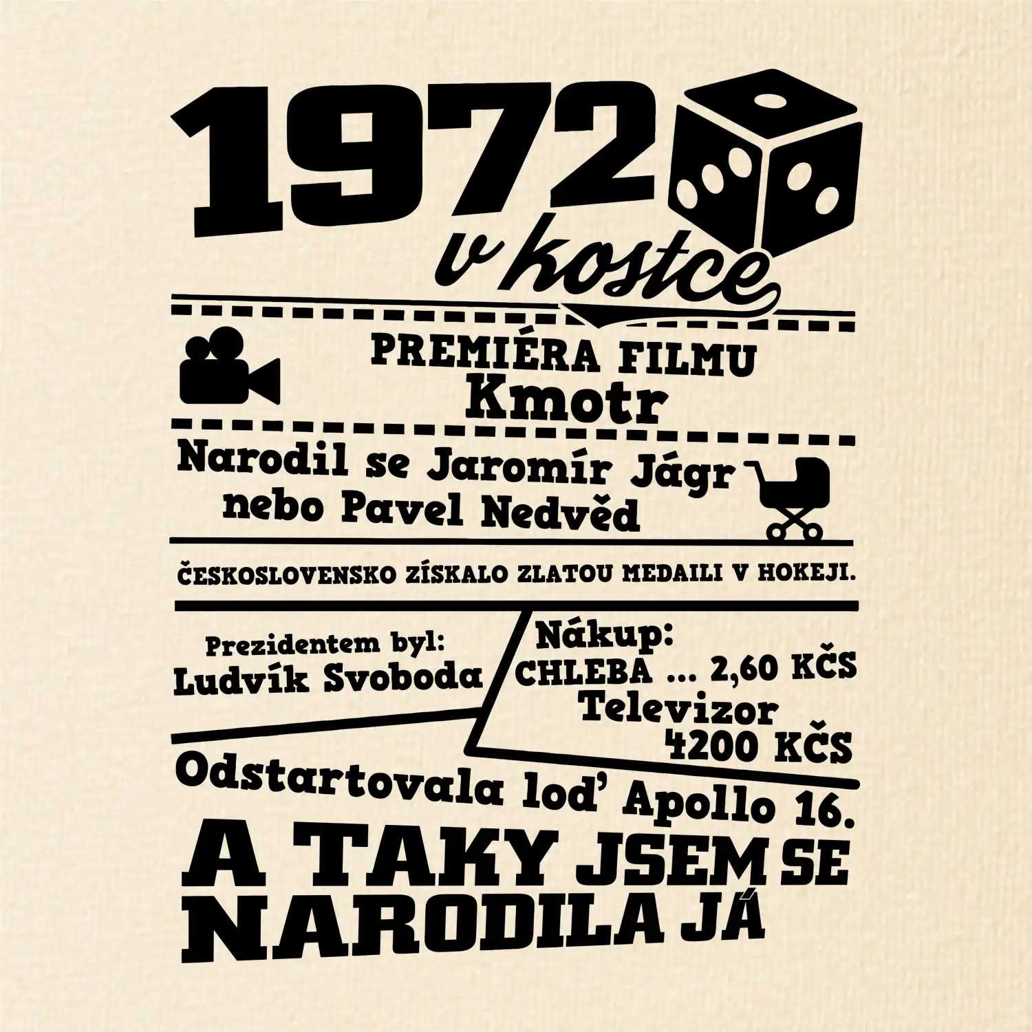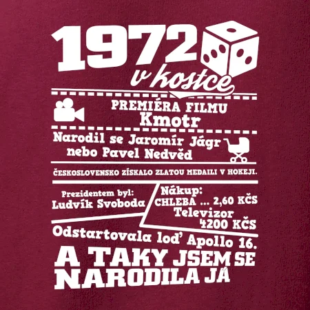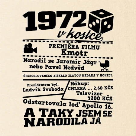 Narozeninové tričko pro ročník 1972. Sháníš originální dárek? Triko pro ročník 1972 v kostce je ten nejlepší dárek, kterým jistě potěšíš. Kolik co stálo? Kdo byl prezident? Kdo se narodil? Všechno tohle a ještě mnohem víc najdeš na našem oslaveneckém triku!