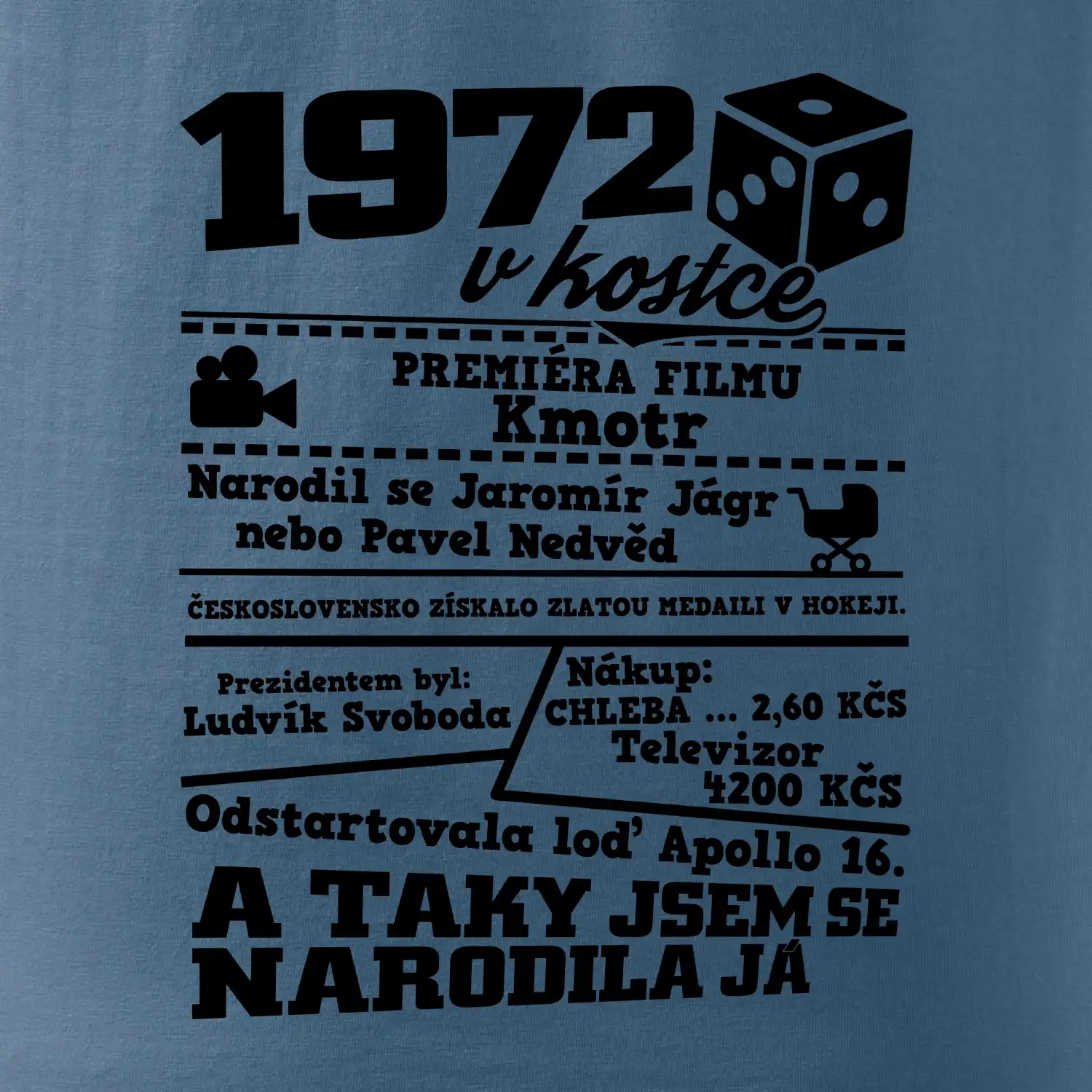 Narozeninové tričko pro ročník 1972. Sháníš originální dárek? Triko pro ročník 1972 v kostce je ten nejlepší dárek, kterým jistě potěšíš. Kolik co stálo? Kdo byl prezident? Kdo se narodil? Všechno tohle a ještě mnohem víc najdeš na našem oslaveneckém triku!