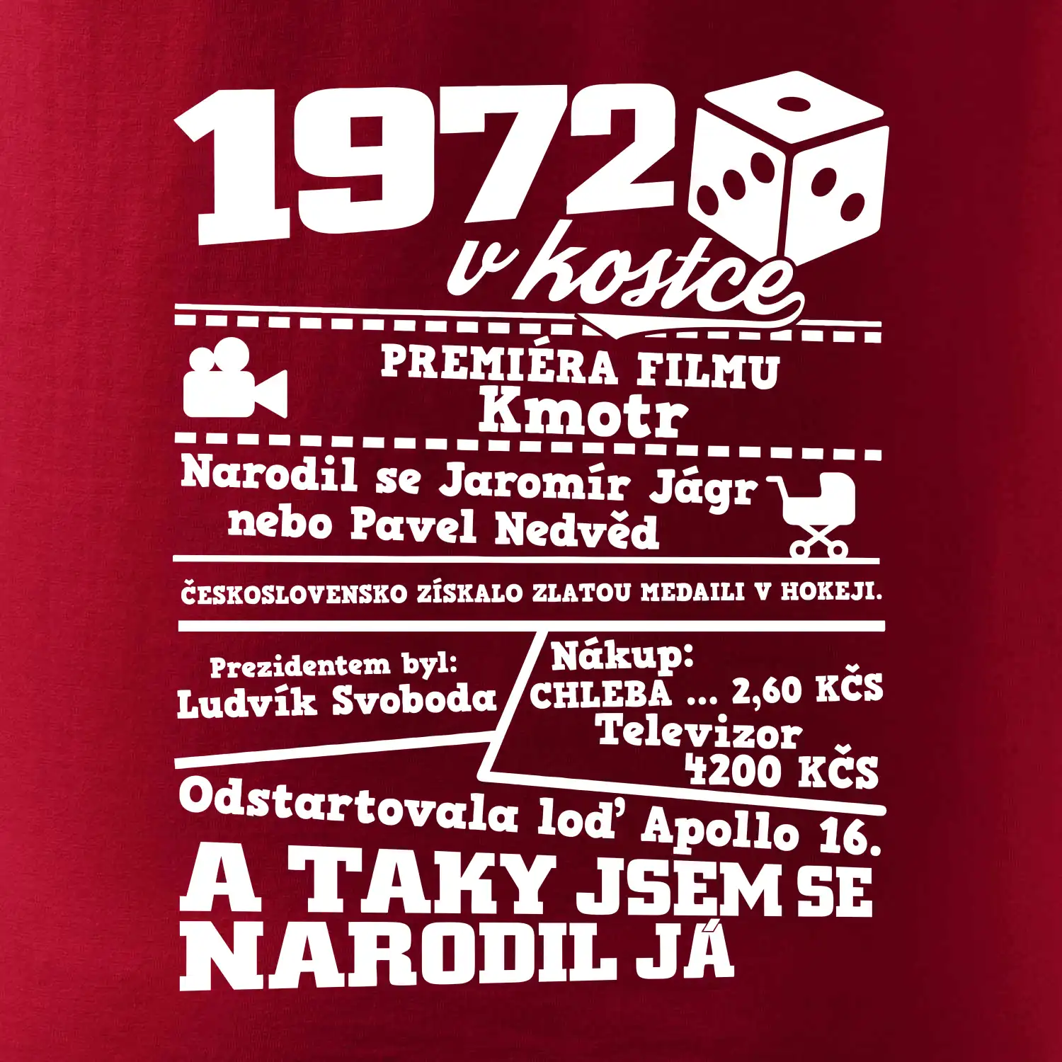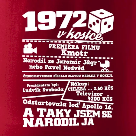 Narozeninové tričko pro ročník 1972. Sháníš originální dárek? Triko pro ročník 1972 v kostce je ten nejlepší dárek, kterým jistě potěšíš. Kolik co stálo? Kdo byl prezident? Kdo se narodil? Všechno tohle a ještě mnohem víc najdeš na našem oslaveneckém triku!
