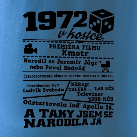 Narozeninové tričko pro ročník 1972. Sháníš originální dárek? Triko pro ročník 1972 v kostce je ten nejlepší dárek, kterým jistě potěšíš. Kolik co stálo? Kdo byl prezident? Kdo se narodil? Všechno tohle a ještě mnohem víc najdeš na našem oslaveneckém triku!