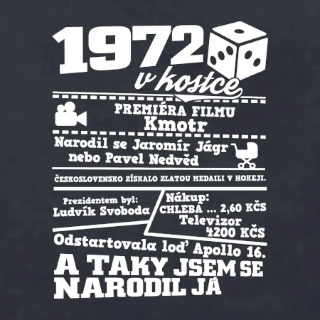 Narozeninové tričko pro ročník 1972. Sháníš originální dárek? Triko pro ročník 1972 v kostce je ten nejlepší dárek, kterým jistě potěšíš. Kolik co stálo? Kdo byl prezident? Kdo se narodil? Všechno tohle a ještě mnohem víc najdeš na našem oslaveneckém triku!