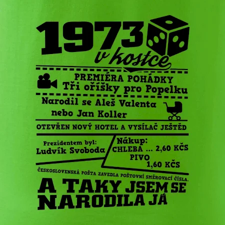 Narozeninové tričko pro ročník 1973. Sháníš originální dárek? Triko pro ročník 1973 v kostce je ten nejlepší dárek, kterým jistě potěšíš. Kolik co stálo? Kdo byl prezident? Kdo se narodil? Všechno tohle a ještě mnohem víc najdeš na našem oslaveneckém triku!