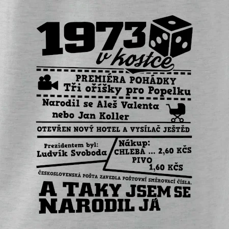 Narozeninové tričko pro ročník 1973. Sháníš originální dárek? Triko pro ročník 1973 v kostce je ten nejlepší dárek, kterým jistě potěšíš. Kolik co stálo? Kdo byl prezident? Kdo se narodil? Všechno tohle a ještě mnohem víc najdeš na našem oslaveneckém triku!