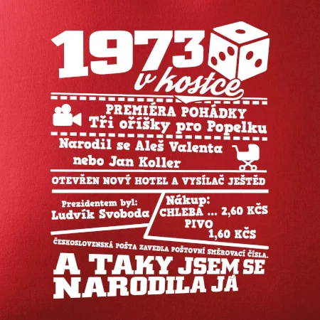 Narozeninové tričko pro ročník 1973. Sháníš originální dárek? Triko pro ročník 1973 v kostce je ten nejlepší dárek, kterým jistě potěšíš. Kolik co stálo? Kdo byl prezident? Kdo se narodil? Všechno tohle a ještě mnohem víc najdeš na našem oslaveneckém triku!