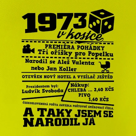 Narozeninové tričko pro ročník 1973. Sháníš originální dárek? Triko pro ročník 1973 v kostce je ten nejlepší dárek, kterým jistě potěšíš. Kolik co stálo? Kdo byl prezident? Kdo se narodil? Všechno tohle a ještě mnohem víc najdeš na našem oslaveneckém triku!