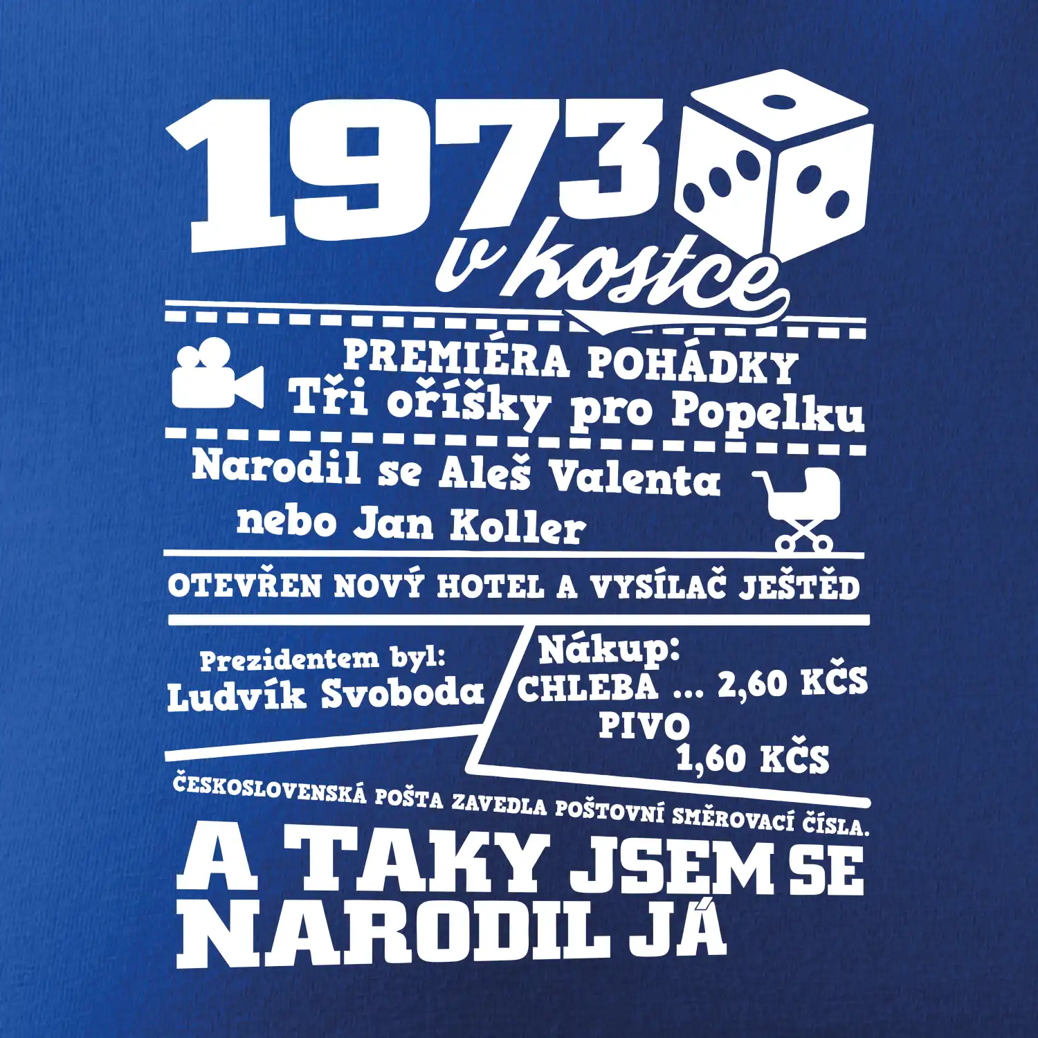 Narozeninové tričko pro ročník 1973. Sháníš originální dárek? Triko pro ročník 1973 v kostce je ten nejlepší dárek, kterým jistě potěšíš. Kolik co stálo? Kdo byl prezident? Kdo se narodil? Všechno tohle a ještě mnohem víc najdeš na našem oslaveneckém triku!