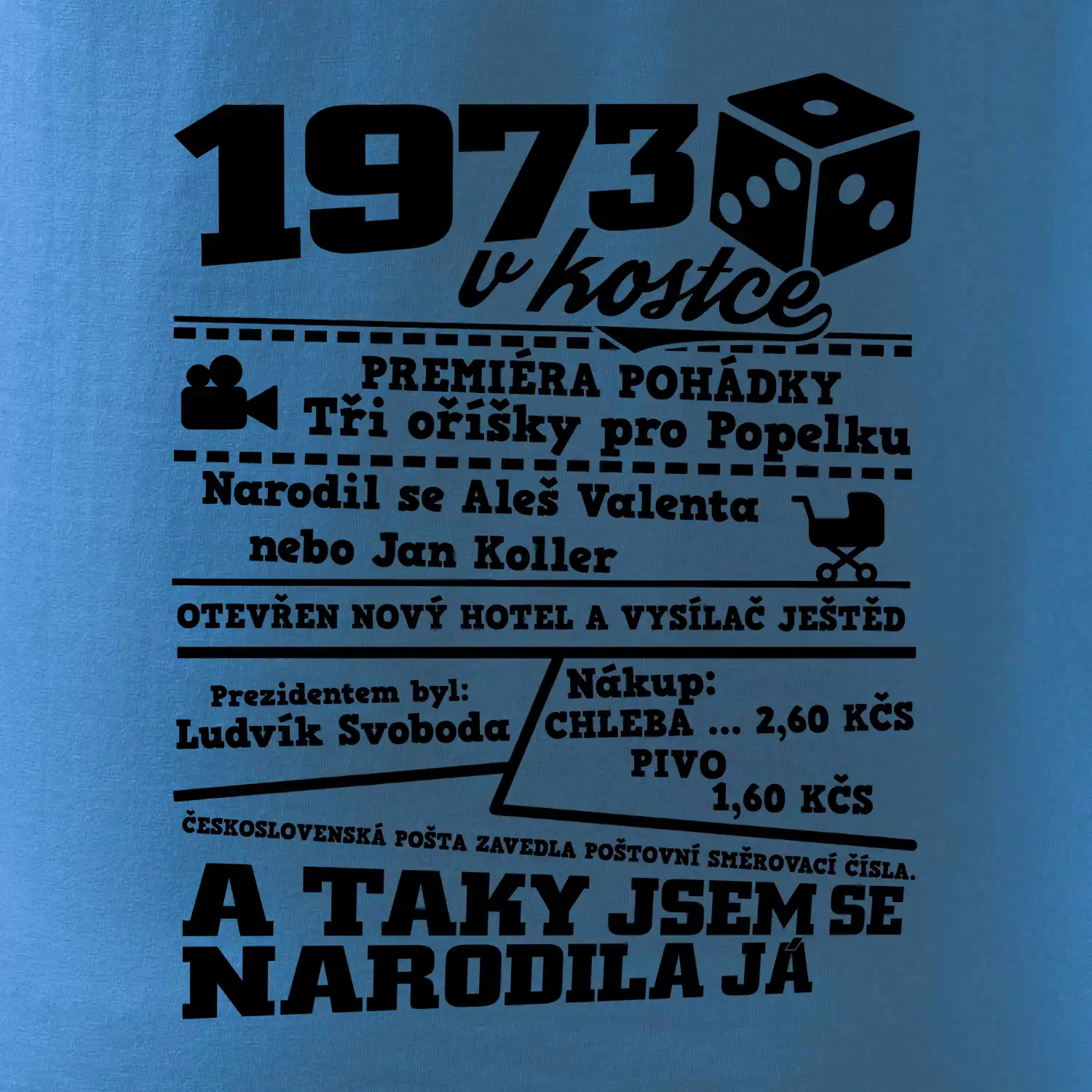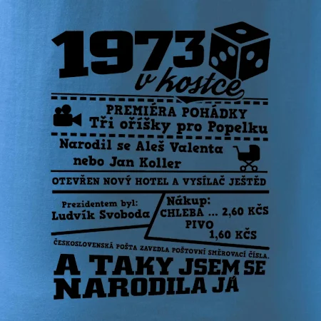 Narozeninové tričko pro ročník 1973. Sháníš originální dárek? Triko pro ročník 1973 v kostce je ten nejlepší dárek, kterým jistě potěšíš. Kolik co stálo? Kdo byl prezident? Kdo se narodil? Všechno tohle a ještě mnohem víc najdeš na našem oslaveneckém triku!