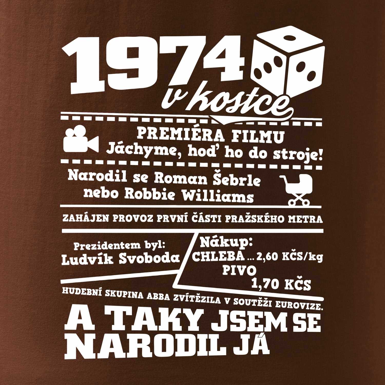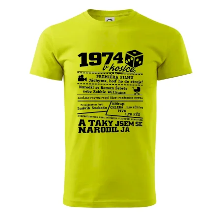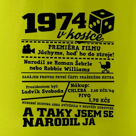 Narozeninové tričko pro ročník 1974. Sháníš originální dárek? Triko pro ročník 1974 v kostce je ten nejlepší dárek, kterým jistě potěšíš. Kolik co stálo? Kdo byl prezident? Kdo se narodil? Všechno tohle a ještě mnohem víc najdeš na našem oslaveneckém triku!