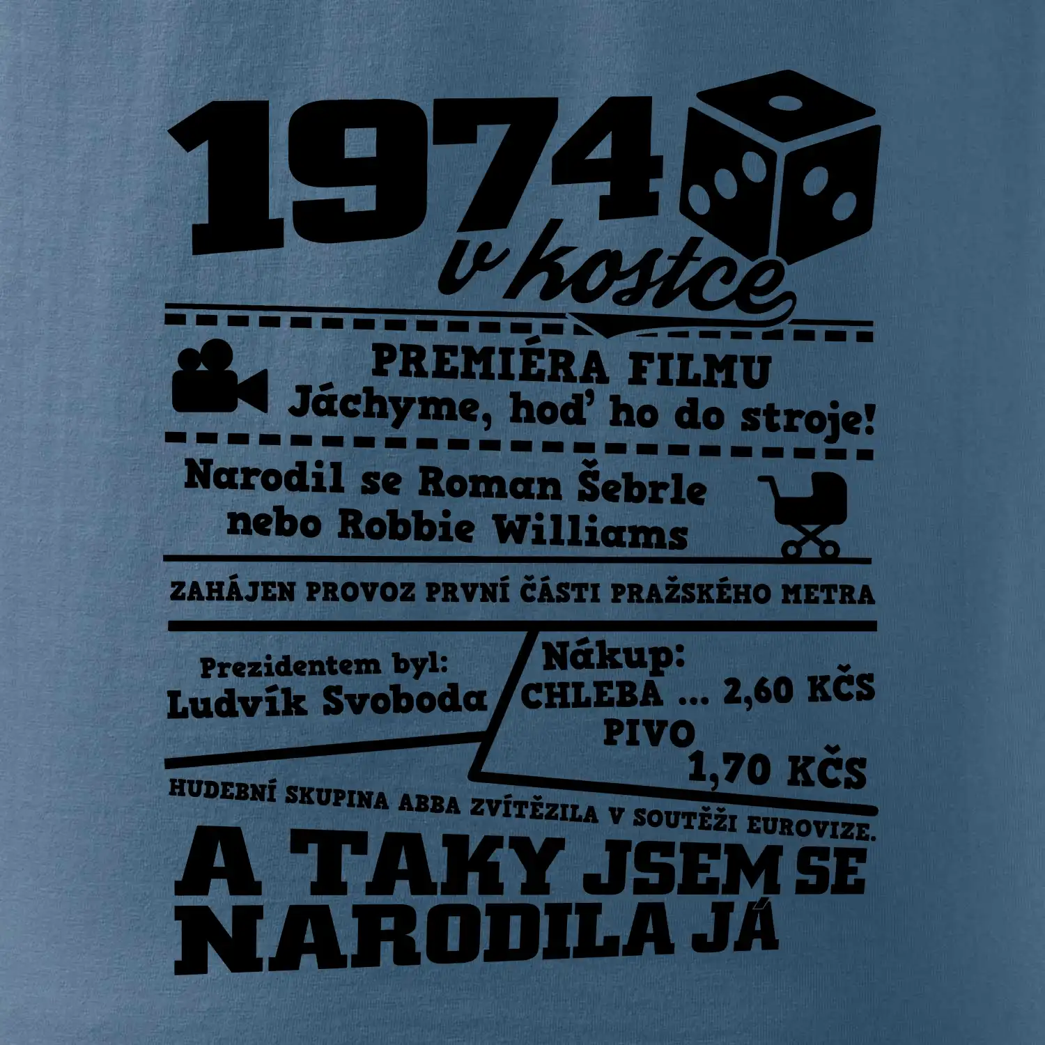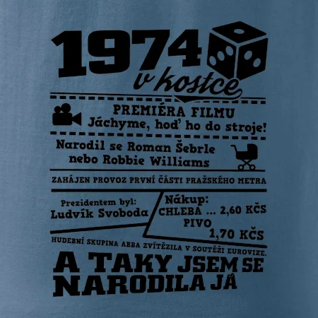 Narozeninové tričko pro ročník 1974. Sháníš originální dárek? Triko pro ročník 1974 v kostce je ten nejlepší dárek, kterým jistě potěšíš. Kolik co stálo? Kdo byl prezident? Kdo se narodil? Všechno tohle a ještě mnohem víc najdeš na našem oslaveneckém triku!